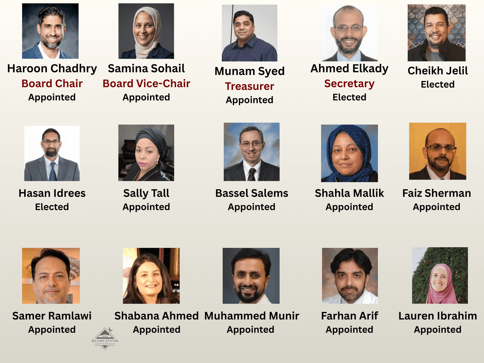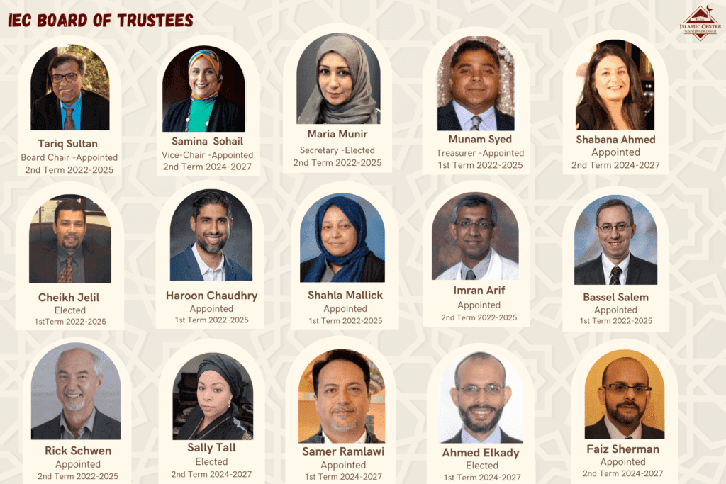 The Islamic Center of Greater Cincinnati (ICGC) is governed by the Islamic Educational Council (IEC), which has a board of trustees. This governing body, consisting of both board-appointed as well as membership-elected trustees, has the ultimate responsibility of setting the overall direction of the organization, its vision, mission, and core values. The BOT meets quarterly.